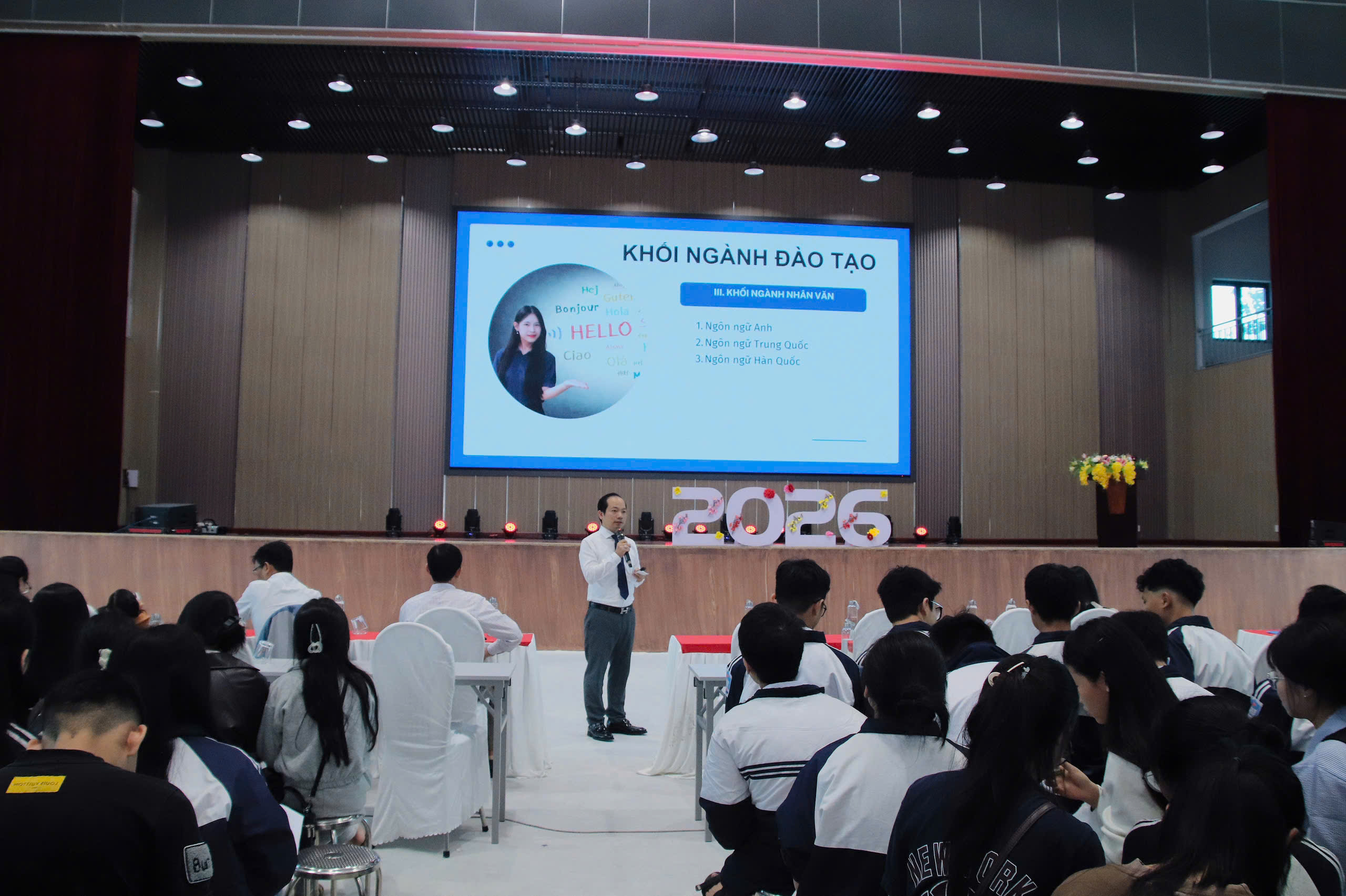 Một điểm nhấn đáng chú ý của chương trình là phần giải đáp thông tin tuyển sinh và định hướng ngành học do thầy Nguyễn Ngọc Minh – Trưởng phòng Tuyển sinh và Truyền thông trực tiếp chia sẻ. Tại đây, học sinh đã được cung cấp nhiều thông tin quan trọng về Trường Đại học Thành Đông, các ngành đào tạo, cũng như những phương thức xét tuyển mới dự kiến áp dụng trong năm 2026.
