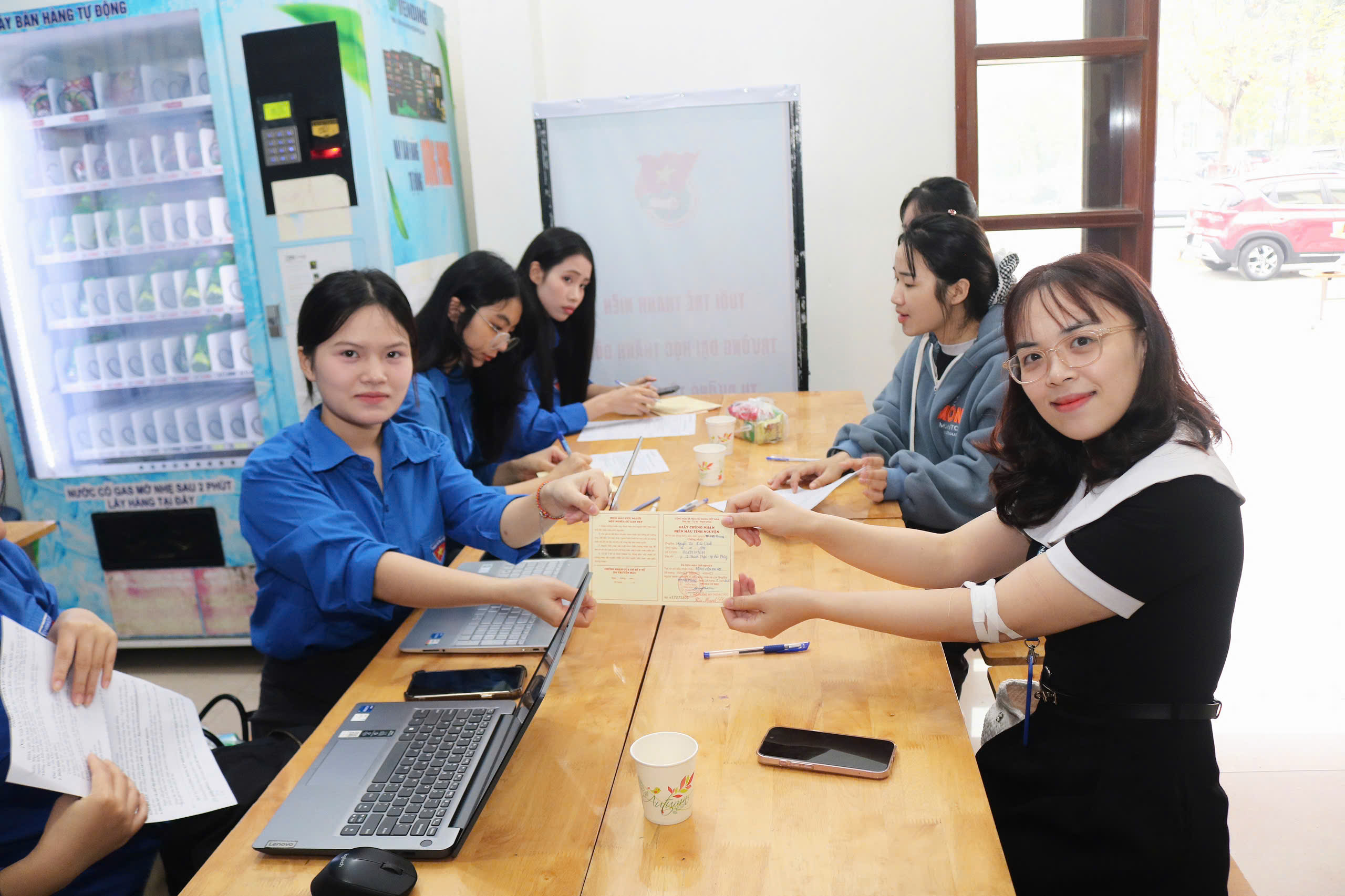 Đông đảo sinh viên, giảng viên và cán bộ nhà trường xếp hàng làm thủ tục đăng ký hiến máu từ sớm, tạo nên không khí sôi nổi tại Nhà A.