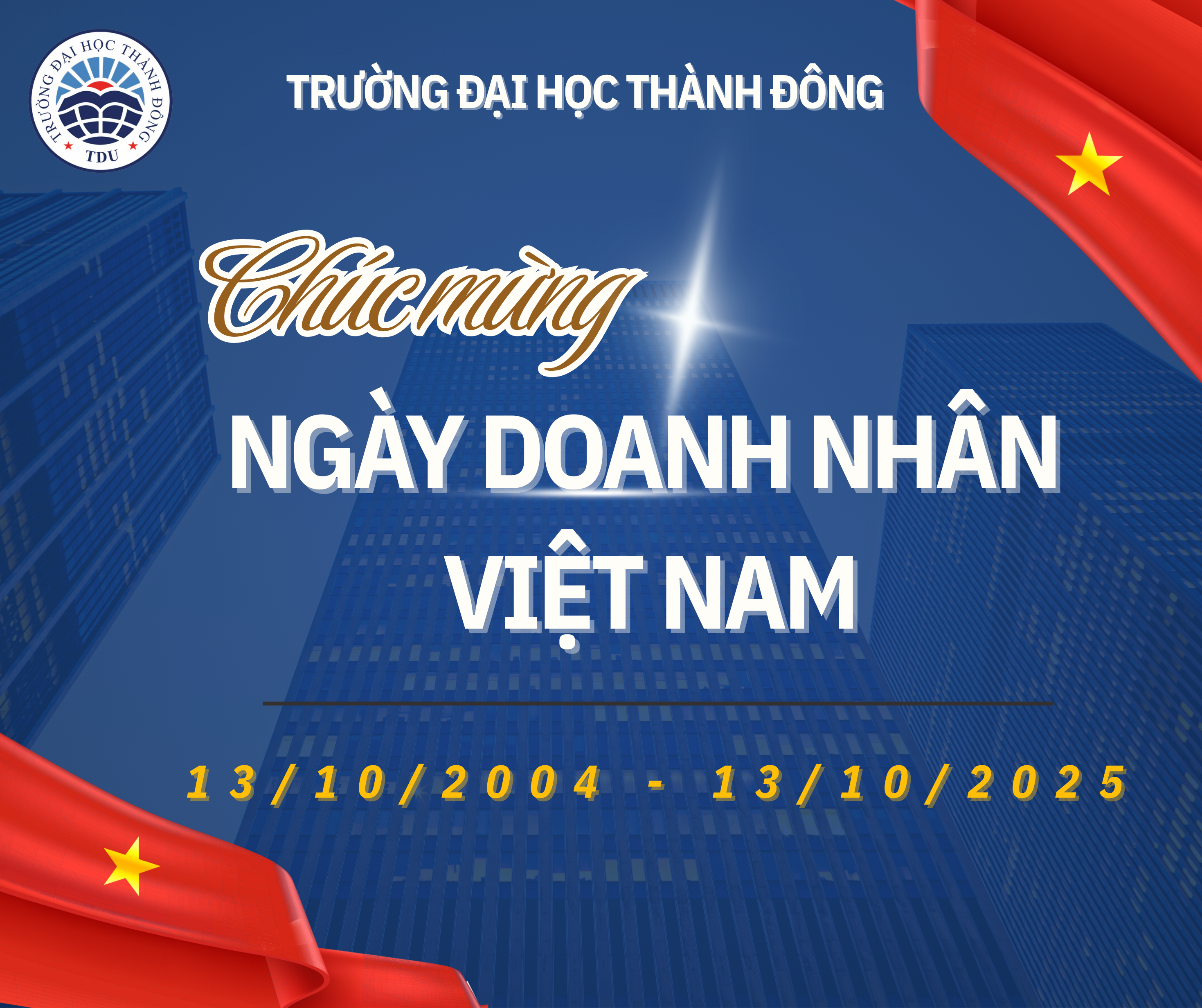 Nhân dịp 21 năm Ngày Doanh nhân Việt Nam (13/10/2004 – 13/10/2025), Trường Đại học Thành Đông trân trọng gửi tới toàn thể doanh nhân Việt Nam, những người đang ngày đêm nỗ lực vì sự phát triển của đất nước lời chúc tốt đẹp nhất.