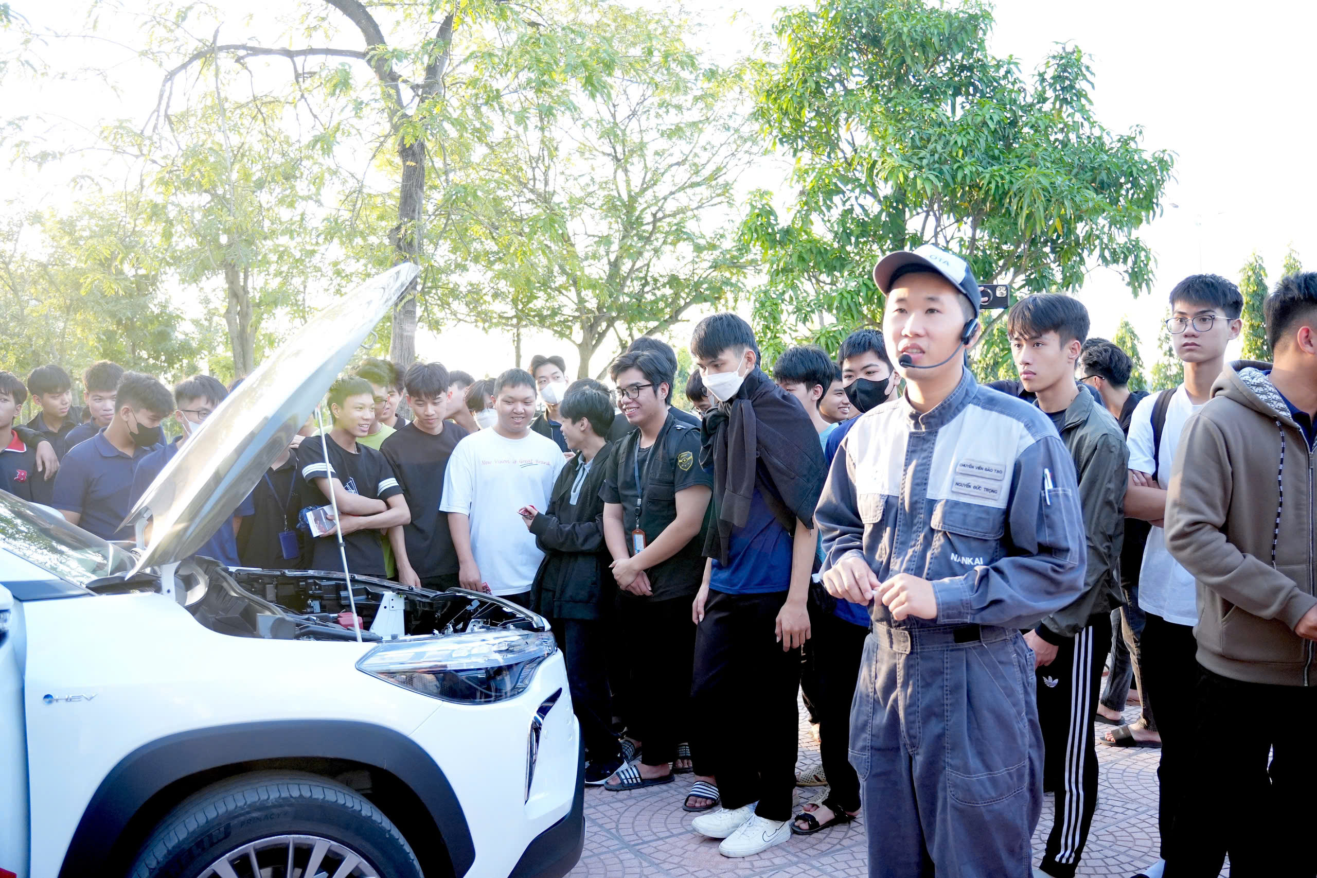Đặc biệt, Toyota Nankai Hải Phòng mang đến buổi đào tạo một chiếc Toyota Corolla Cross Hybrid 2025 để sinh viên trực tiếp quan sát, thực hành và tiếp cận công nghệ trên phương tiện thực tế. Hoạt động trải nghiệm này nhận được sự hưởng ứng nhiệt tình của sinh viên, giúp các em hiểu rõ hơn về quy trình kiểm tra, bảo dưỡng và vận hành hệ thống Hybrid.