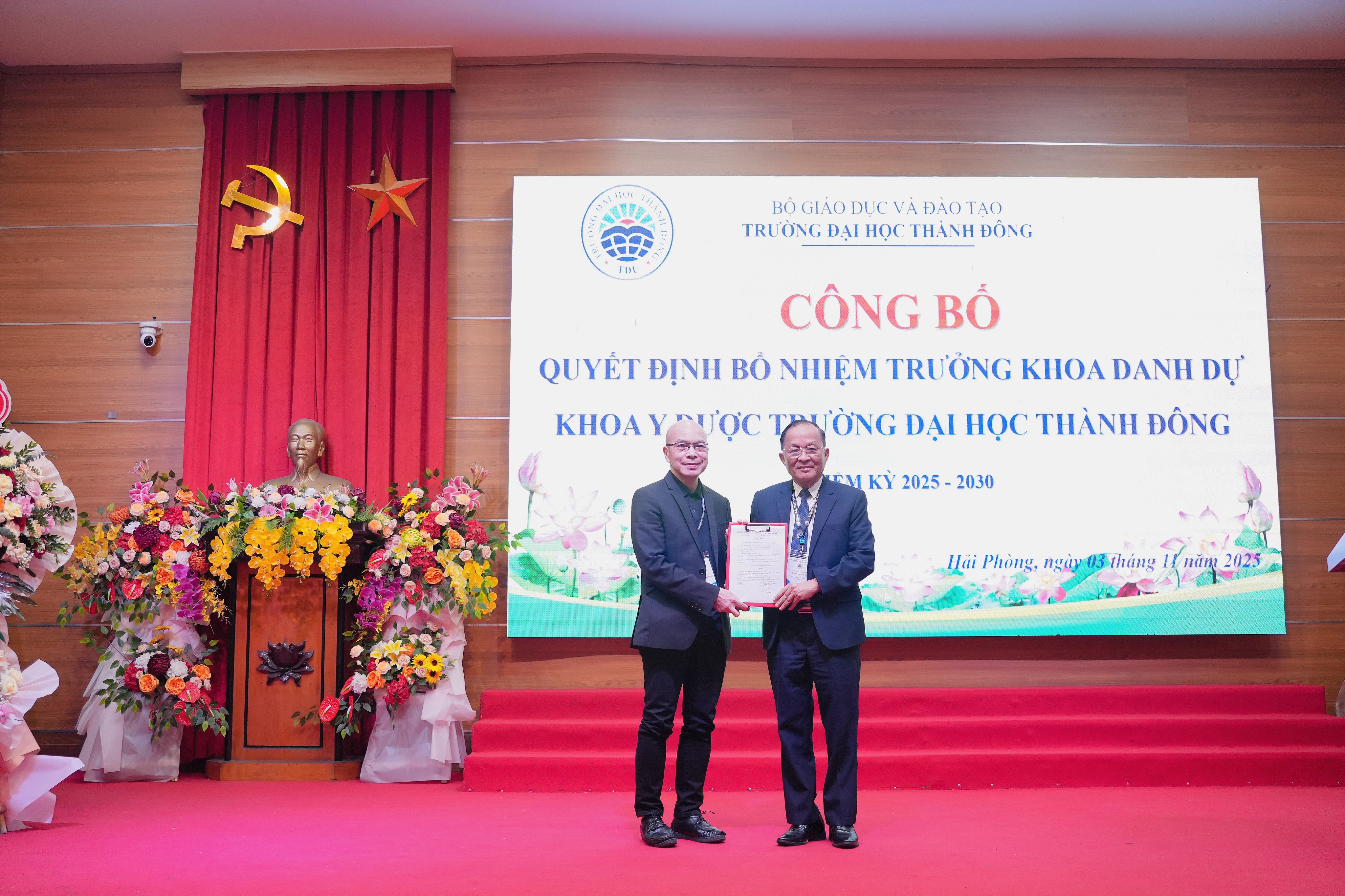 Trong khuôn khổ chương trình, Trường Đại học Thành Đông cũng công bố Quyết định bổ nhiệm GS.TS.BS. Đinh Xuân Anh Tuấn giữ chức vụ Trưởng khoa Danh dự Khoa Y Dược. Đây là sự kiện mang ý nghĩa sâu sắc, thể hiện niềm tin và kỳ vọng của Nhà trường vào sự đồng hành, hỗ trợ của các chuyên gia quốc tế trong việc nâng cao chất lượng đào tạo và nghiên cứu, hướng tới chuẩn mực quốc tế.