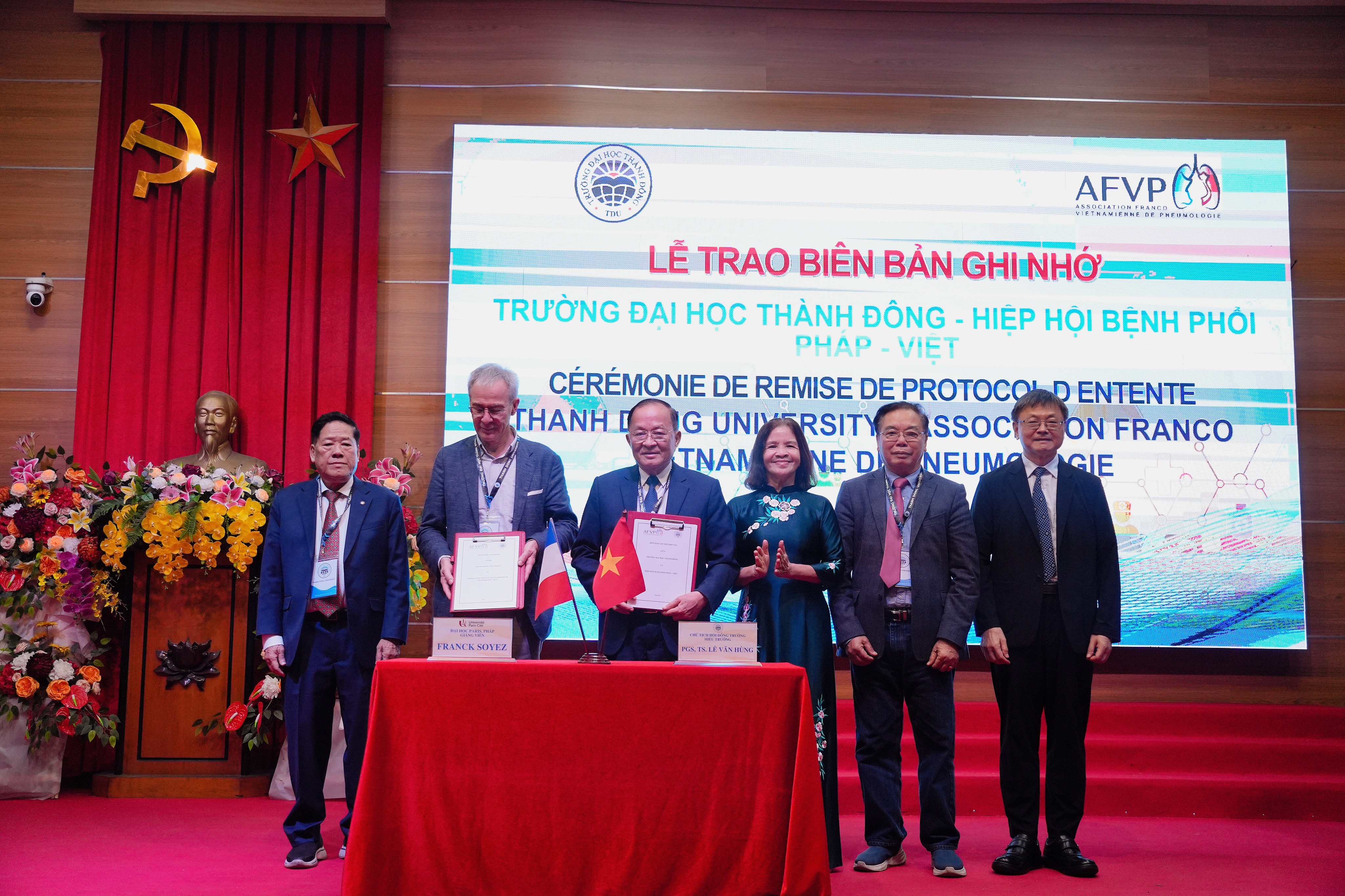 Một điểm nhấn quan trọng trong khuôn khổ hội thảo là lễ ký kết Biên bản ghi nhớ hợp tác (MoU) giữa Trường Đại học Thành Đông và Hiệp hội Bệnh phổi Pháp - Việt, đánh dấu bước phát triển mới trong hợp tác đào tạo và nghiên cứu khoa học về y học hô hấp và giấc ngủ.
