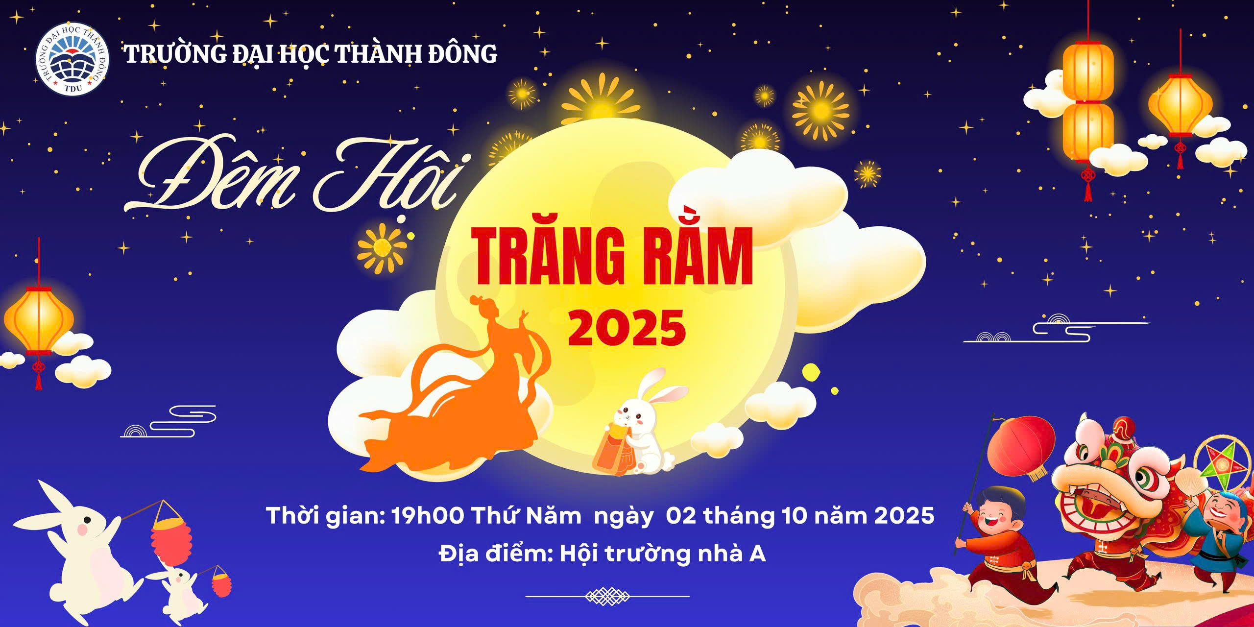 Trong không khí rộn ràng của ngày Tết Trung thu, Trường Đại học Thành Đông sẽ tổ chức chương trình “Đêm hội Trăng rằm 2025 – Trọn vẹn yêu thương, lan tỏa nụ cười” vào lúc 19h00, Thứ Năm, ngày 2/10/2025, tại khuôn viên nhà trường. Đây hứa hẹn sẽ là một đêm hội đặc biệt, mang đến cho các em nhỏ và toàn thể gia đình Thành Đông một mùa Trung thu rực rỡ sắc màu, đong đầy niềm vui và tiếng cười.