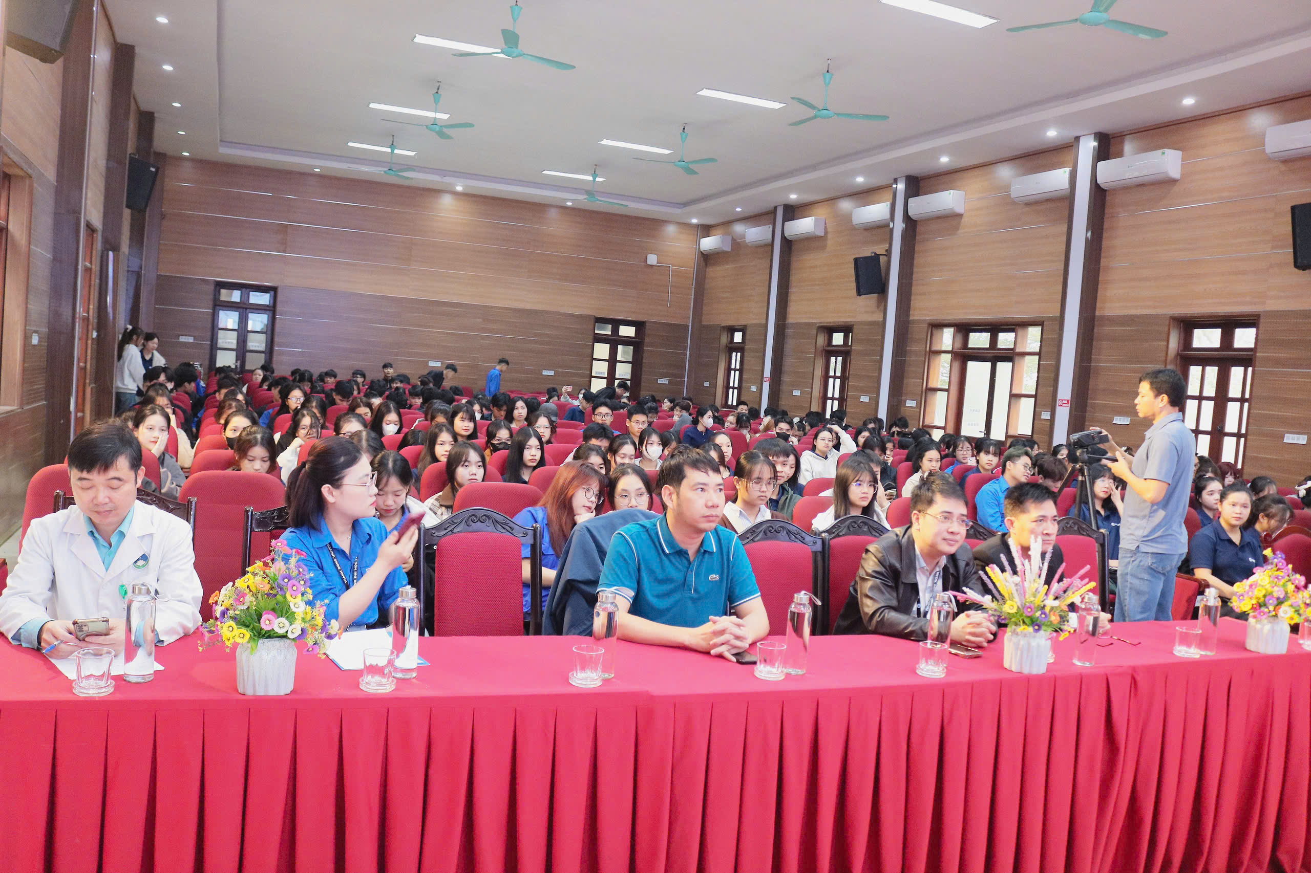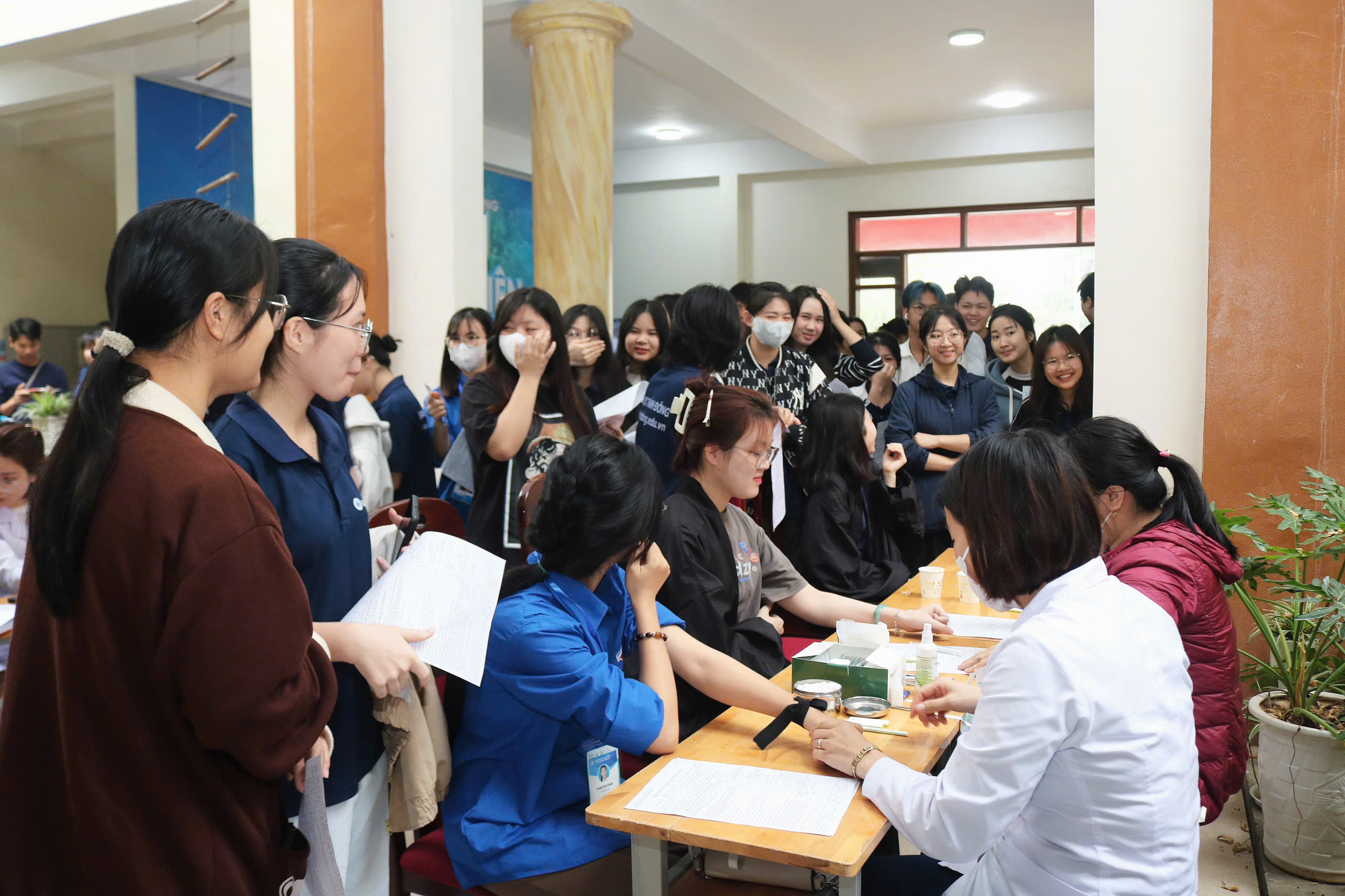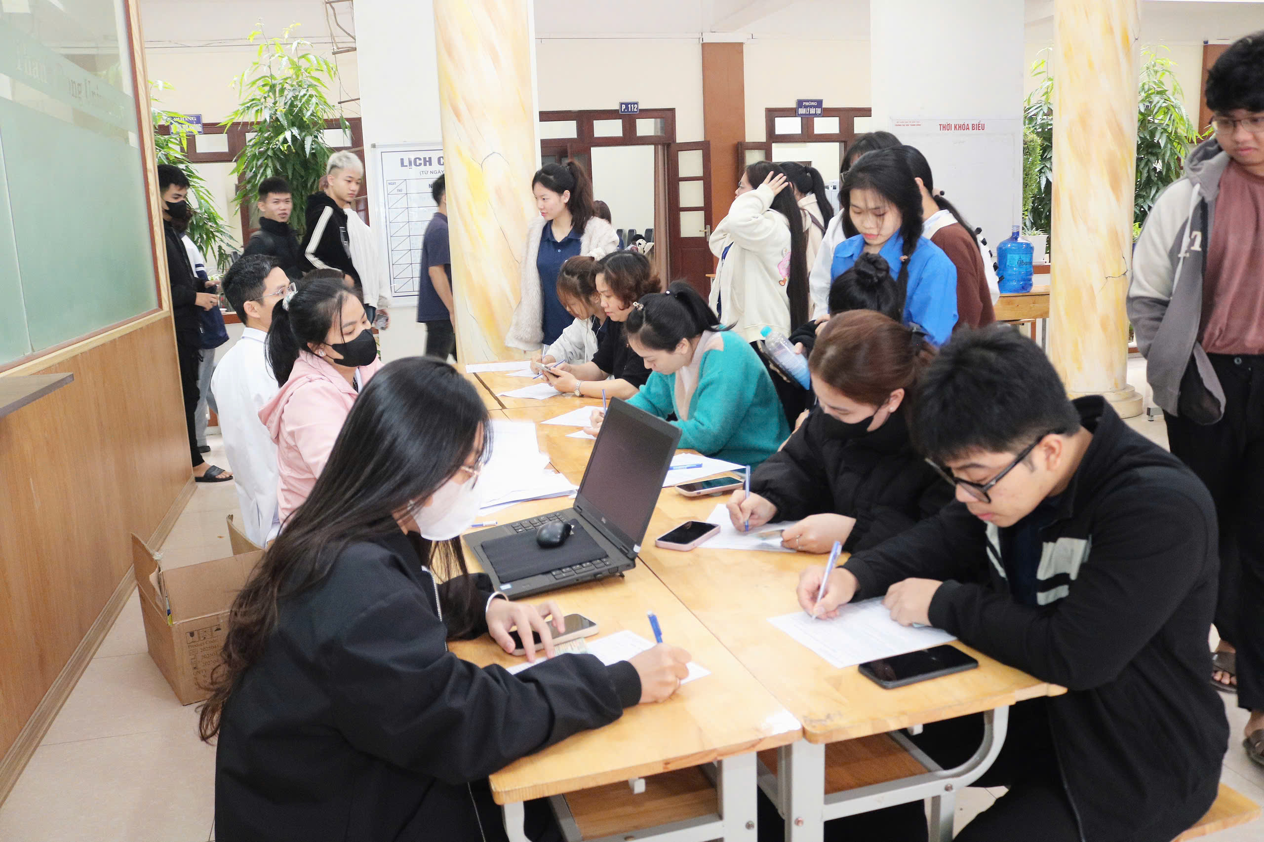Đông đảo sinh viên, giảng viên và cán bộ nhà trường xếp hàng làm thủ tục đăng ký hiến máu từ sớm, tạo nên không khí sôi nổi tại Nhà A.