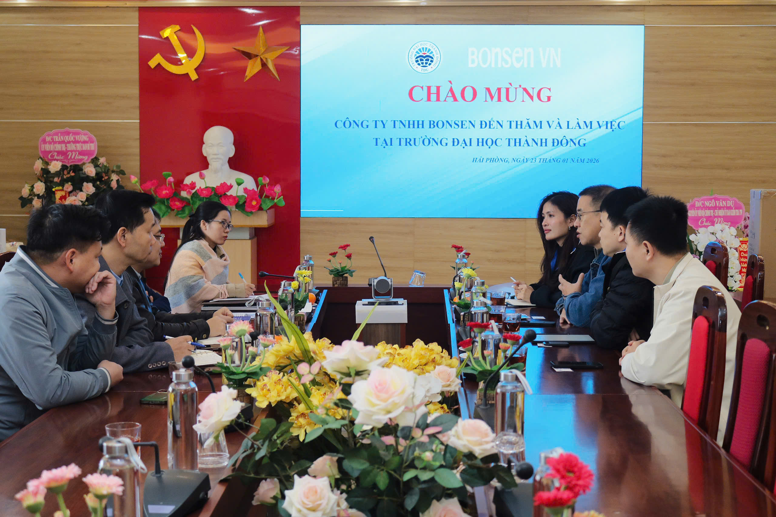 Sáng ngày 23/01/2026, Trường Đại học Thành Đông tổ chức buổi tiếp đón và làm việc với Công ty TNHH Công nghệ Sáng tạo Bonsen Việt Nam, nhằm trao đổi, thảo luận các nội dung hợp tác trong đào tạo, nghiên cứu và hỗ trợ nguồn lực cho Nhà trường trong thời gian tới.