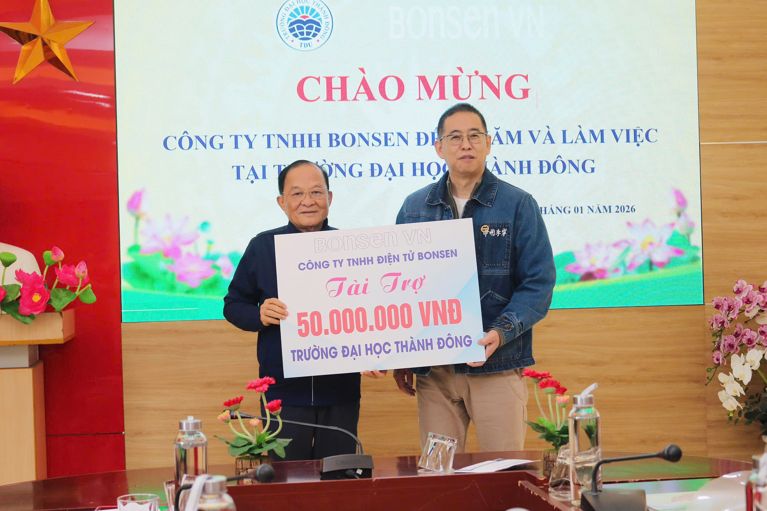 Nhân dịp này, Công ty TNHH Công nghệ Sáng tạo Bonsen Việt Nam đã trao tặng Trường Đại học Thành Đông khoản tài trợ 50 triệu đồng cùng các thiết bị văn phòng, góp phần nâng cao điều kiện giảng dạy, nghiên cứu và thúc đẩy hiệu quả hợp tác giữa nhà trường và doanh nghiệp trong thời gian tới.