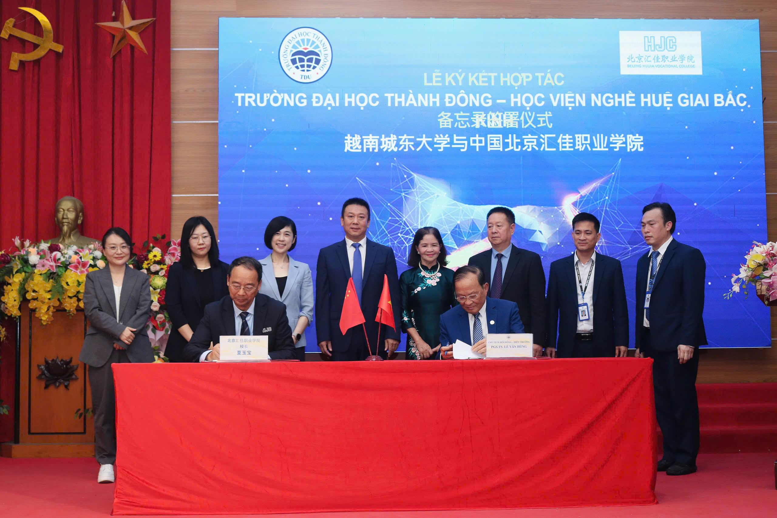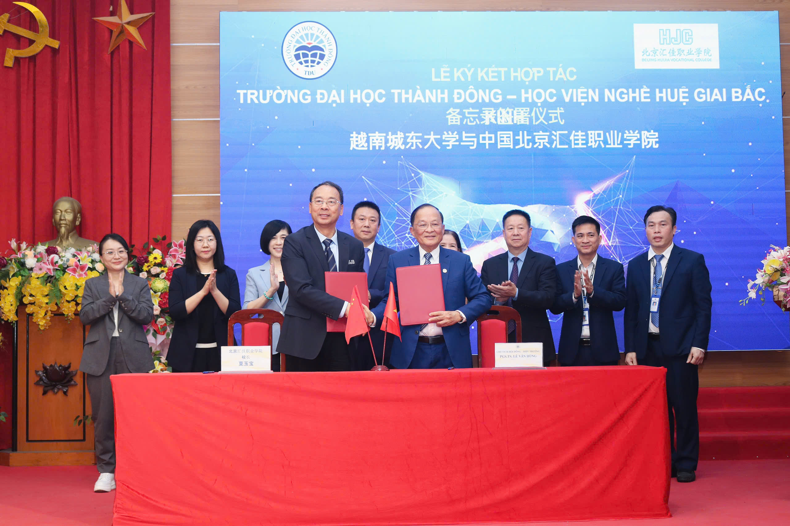 Ngay sau đó, Trường Đại học Thành Đông tiếp tục ký kết biên bản ghi nhớ hợp tác với Học viện Nghề Huệ Giai (Huijia) Bắc Kinh. Ông Hạ Ngọc Bảo, Hiệu trưởng Học viện Nghề Huệ Giai, đại diện phía đối tác thực hiện ký kết. Sự kiện đánh dấu bước mở rộng hợp tác trong lĩnh vực đào tạo nghề, trao đổi chuyên gia và triển khai các chương trình đào tạo gắn với nhu cầu thực tiễn của doanh nghiệp.