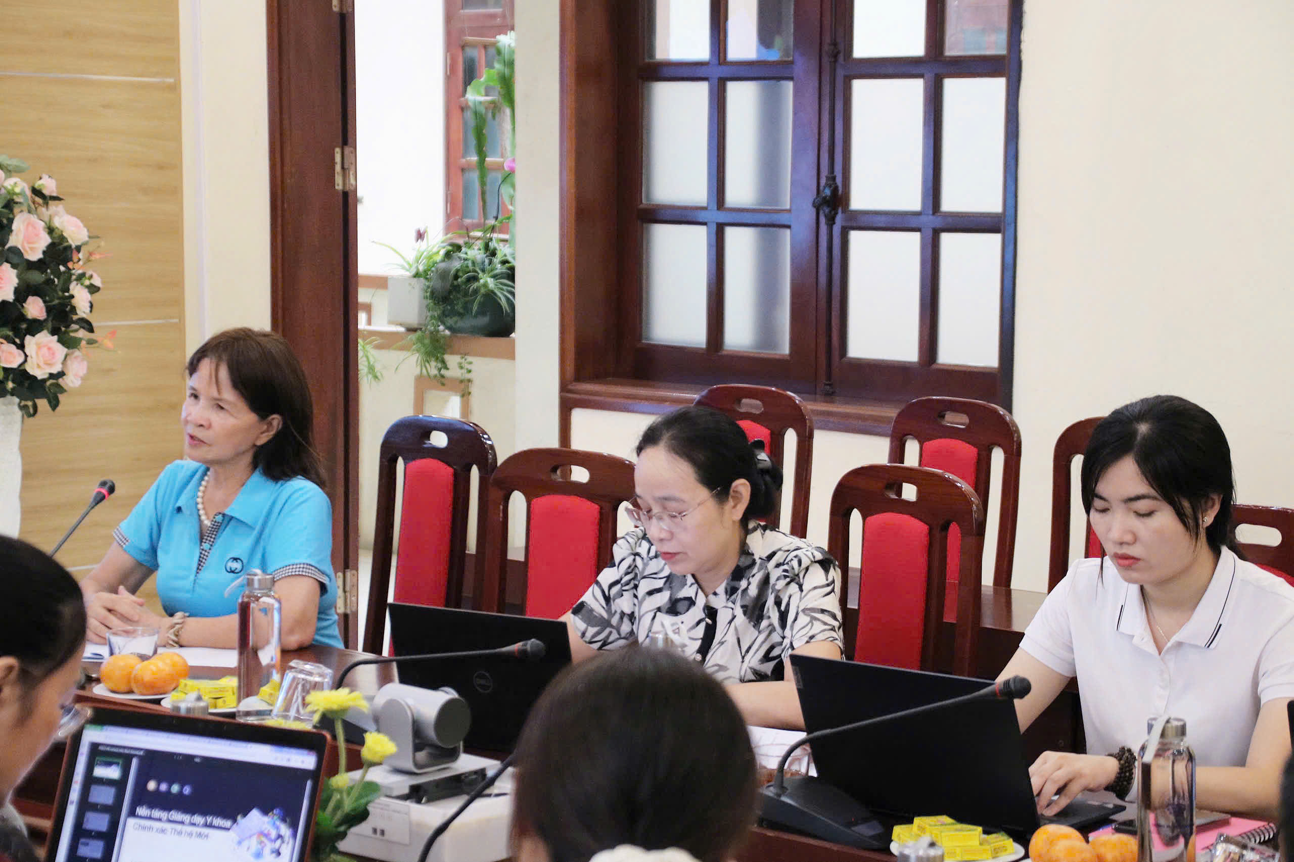 Tiếp nối nội dung, đại diện lãnh đạo nhà trường trình bày định hướng ứng dụng chuyển đổi số trong học tập và thực hành y khoa, nhấn mạnh việc tích hợp các nền tảng số vào chương trình đào tạo nhằm tăng cường hiệu quả giảng dạy, mở rộng khả năng tiếp cận học liệu và nâng cao năng lực tự học của sinh viên.